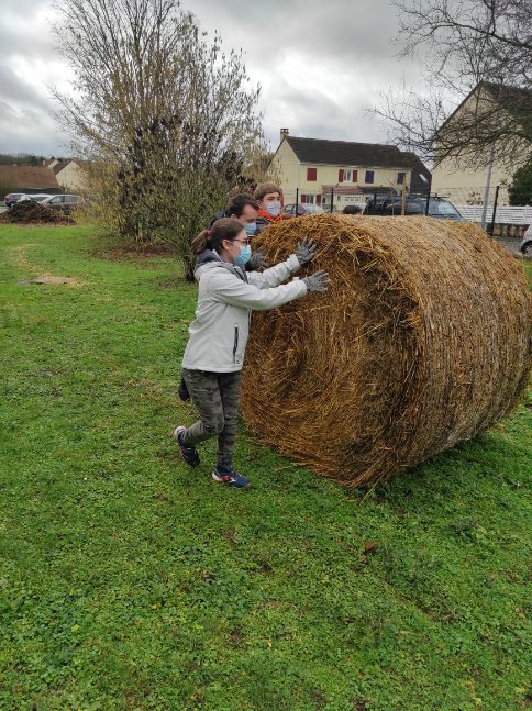 Le jardin met son manteau. Grâce à la paille donnée par M. Blanchet, un super parent d’élève, nous avons pu couvrir l’ensemble des zones de culture de notre jardin en mandala de 15 à 20 cm de paille.