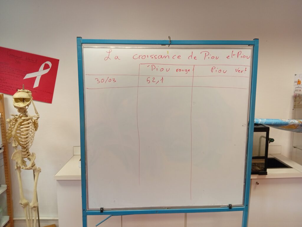 Pesée tous les jours et suivi de leurs évolutions, nos 2 mascottes Piou vert et Piou rouge ont investies la classe.
