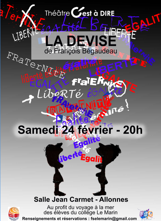 Ce samedi 24 février le FSE du collège organise la tenue d’une pièce de théâtre de la troupe « c’est à dire »d’après le texte de François Bégaudeau. Cette représentation a pour but de financer le voyage à la mer de nos élèves de cinquième.