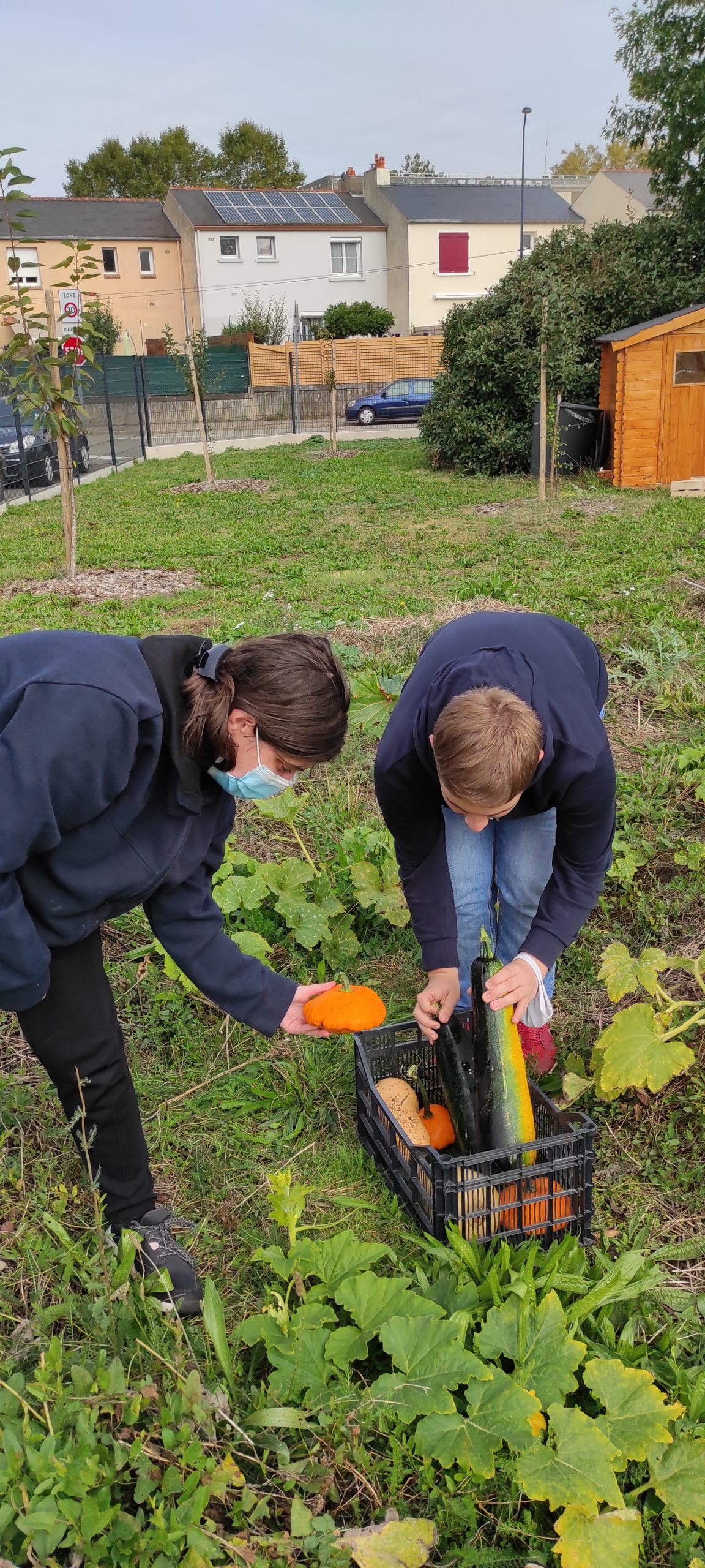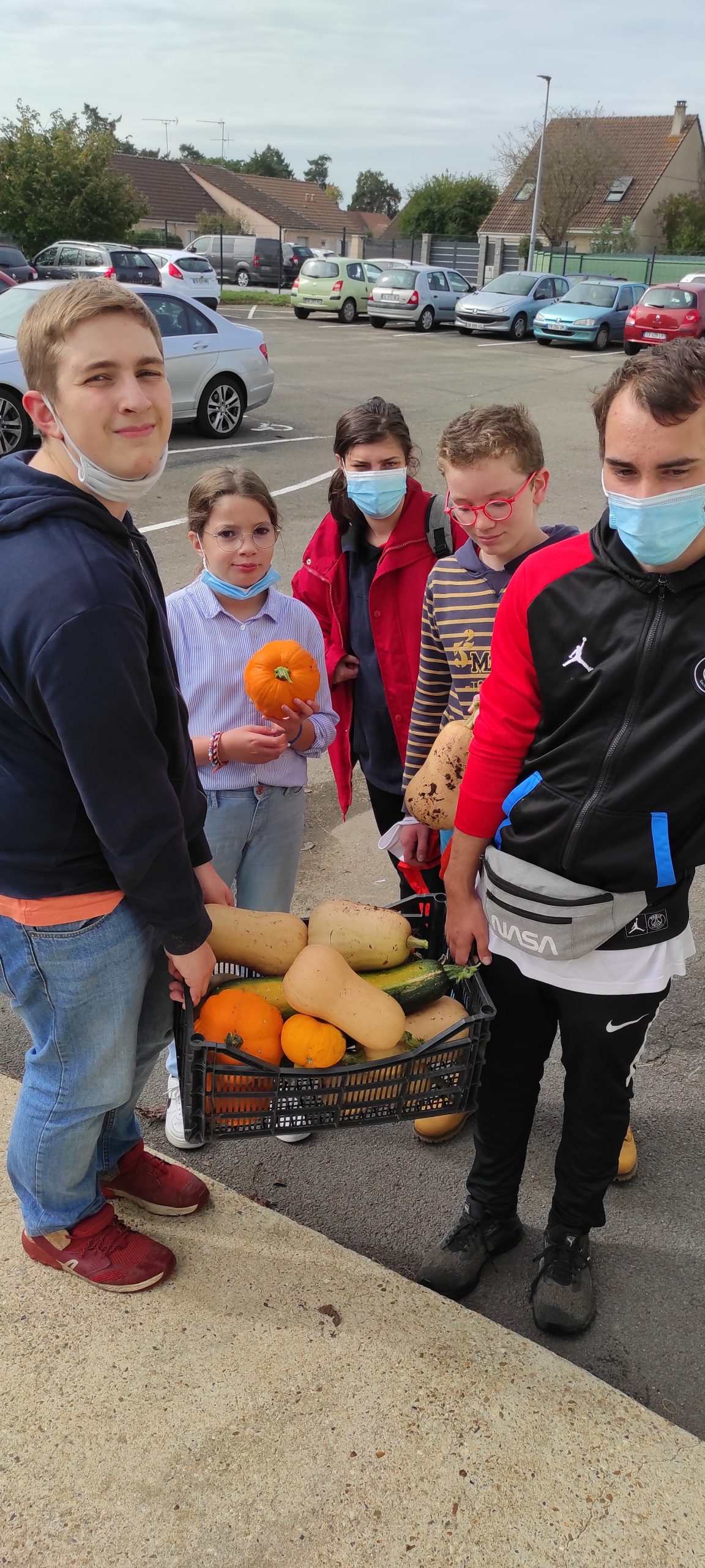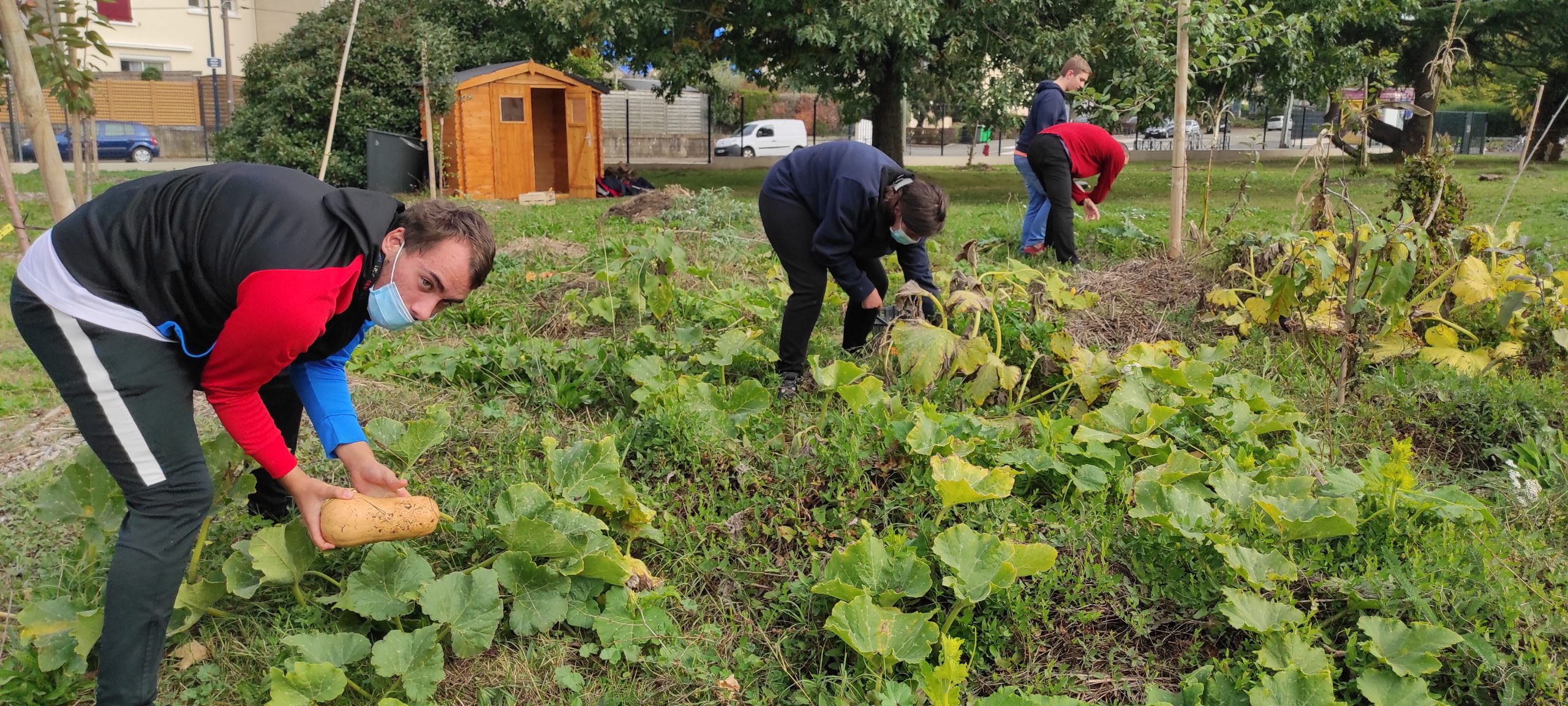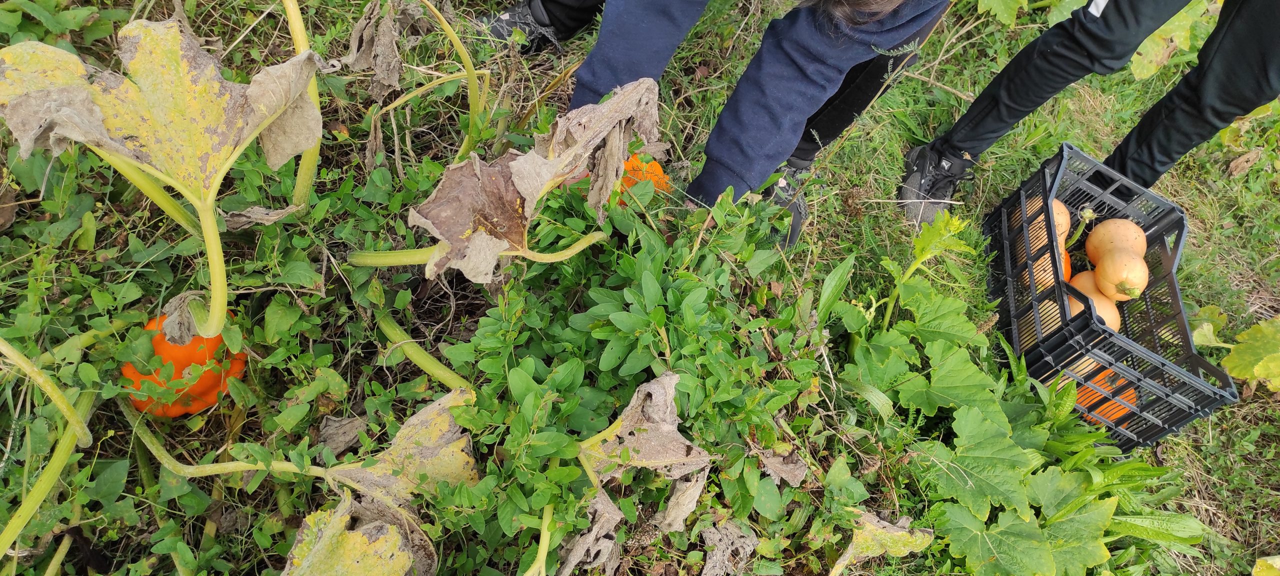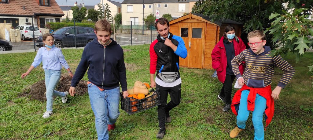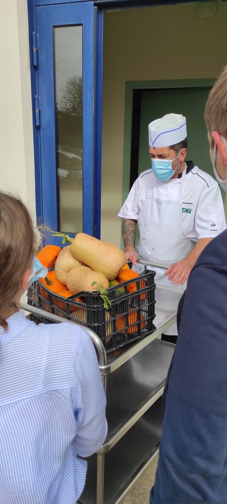 Aujourd’hui c’était récolte pour les élèves du club écolo. Nous avons ramassé courges butternuts, courges musquées, courgettes, pâtisson, aubergines… qui pour le bonheur de tous seront transformées par Jimmy notre chef cuisinier en une succulente soupe.